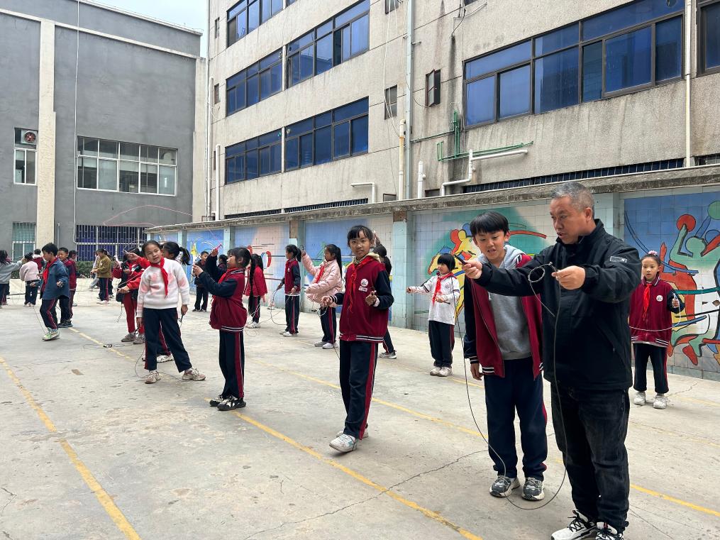 省人大代表洪家亮正教孩子们跳绳。受访者供图