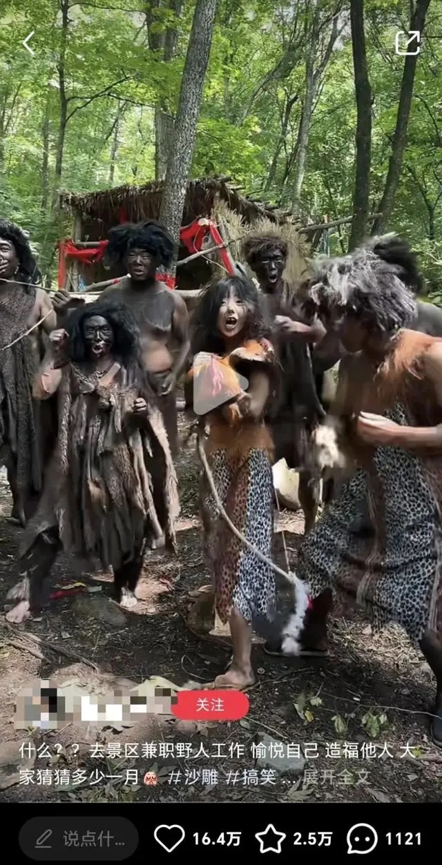 近日,有网友在社交平台分享去景区扮演“野人”的视频,称工作内容就是鬼吼鬼叫,吓唬游客,满景区乱跑,中午还可以抢游客午饭。