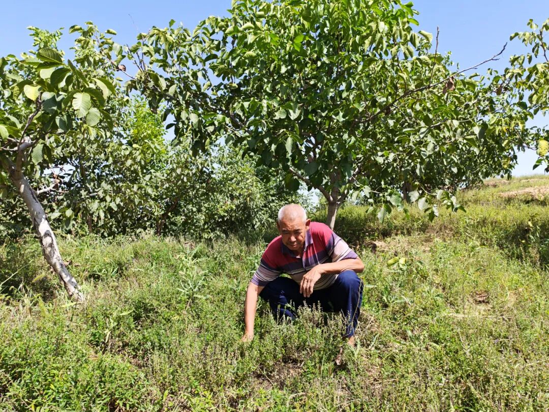 砖庙镇祁家山村村民刘海玉在自家核桃林地查看黄芩生长情况。李小虎/摄